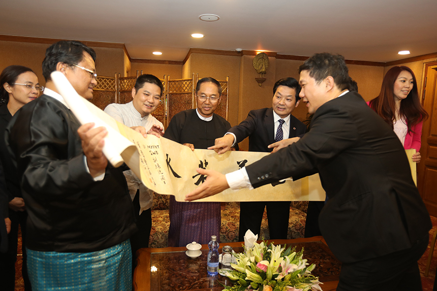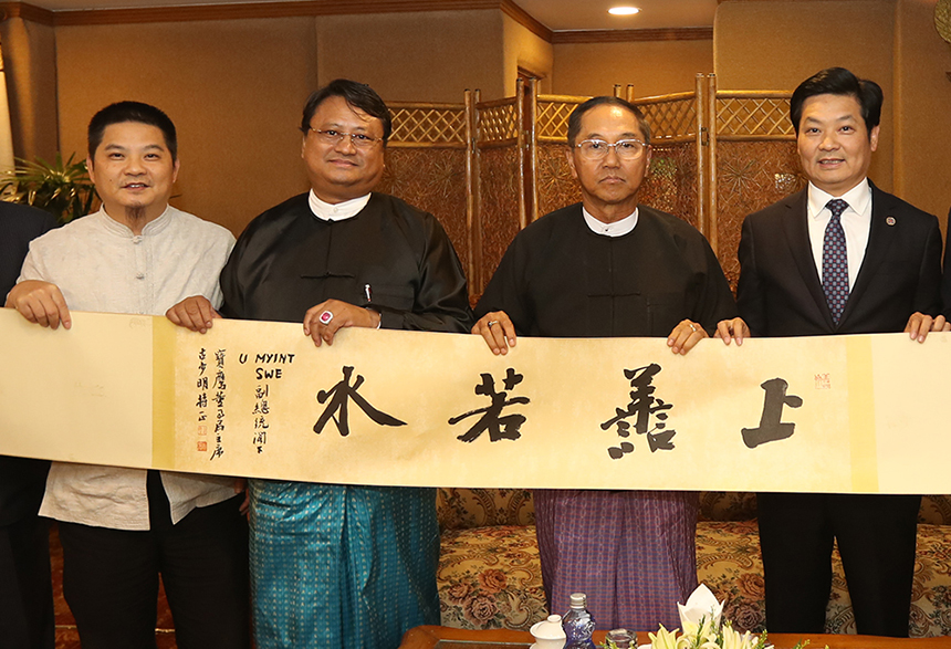會(huì)談后,寶鷹集團(tuán)董事局主席古少明、寶鷹集團(tuán)副總裁古樸向吳敏瑞副總統(tǒng)贈(zèng)送了西泠印人王躍慶書法作品“上善若水”,期望中緬兩國從善如流。