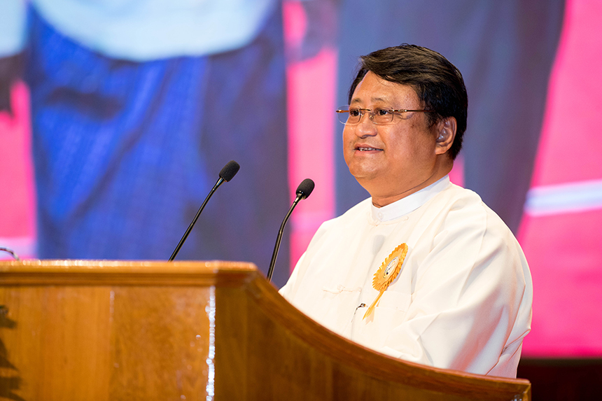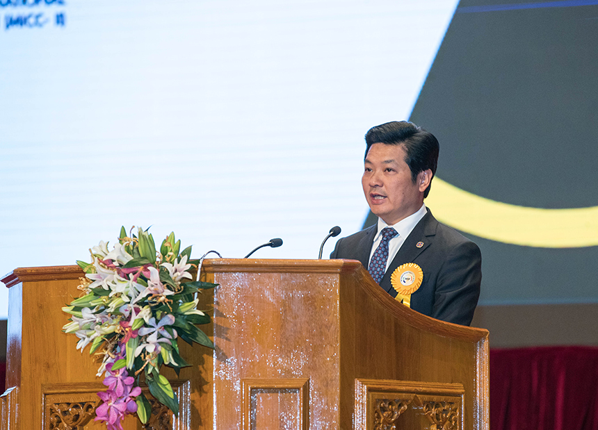 ▲緬甸投資發(fā)展協(xié)會(huì)主席、緬甸KMA集團(tuán)主席欽茂皚致歡迎辭