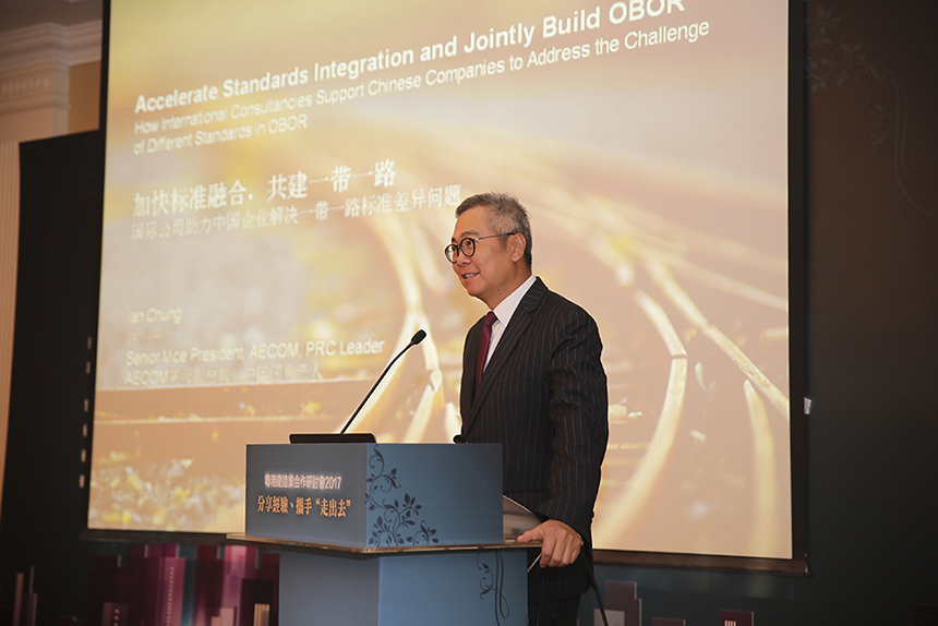 ▲香港AECOM副總裁鐘小平作《加快標(biāo)準(zhǔn)融合 共建一帶一路》主題分享