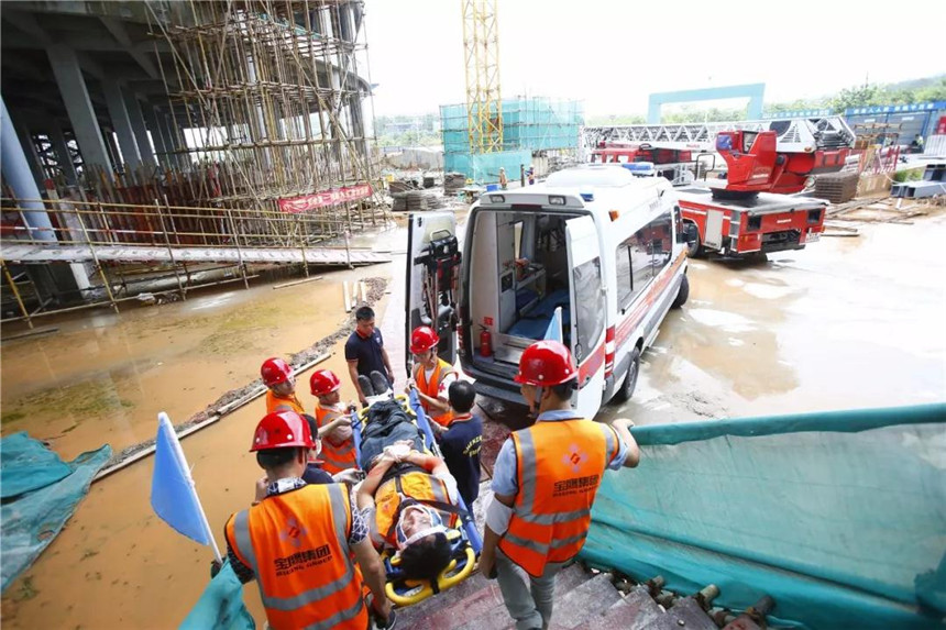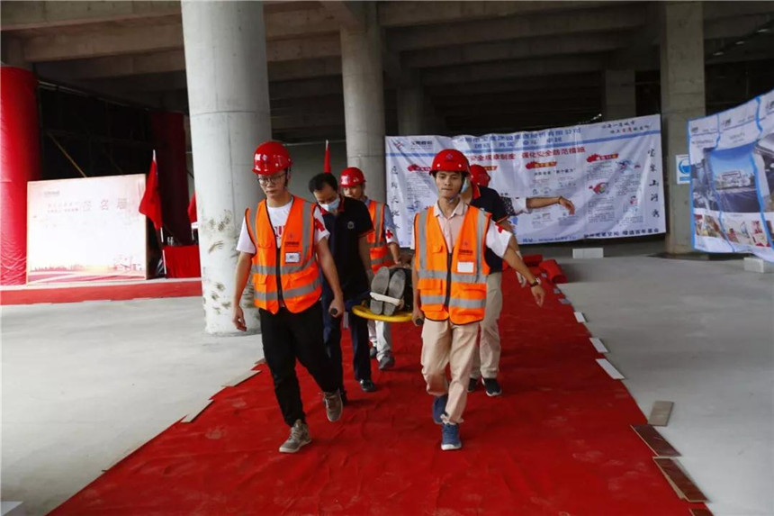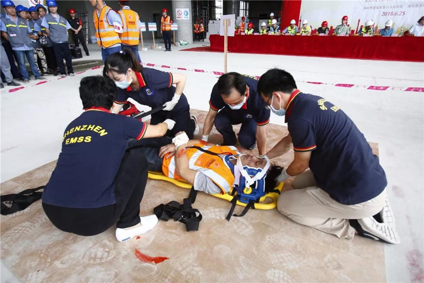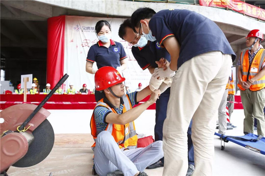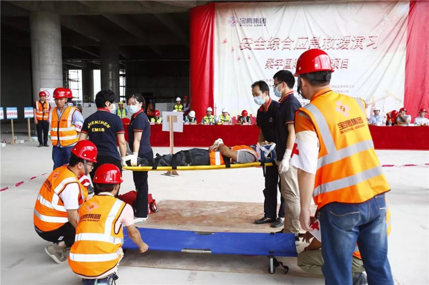 演習(xí)項目分為機械傷害演練、觸電傷害演練、高處墜落演練和消防疏散演練。來自寶鷹集團質(zhì)安管理部、幕墻事業(yè)部和柔宇項目部的九十余名員工,分為安全通訊、疏散警戒、搶險救援、醫(yī)療救護等多組集結(jié)成隊,井然有序地參與演習(xí)。