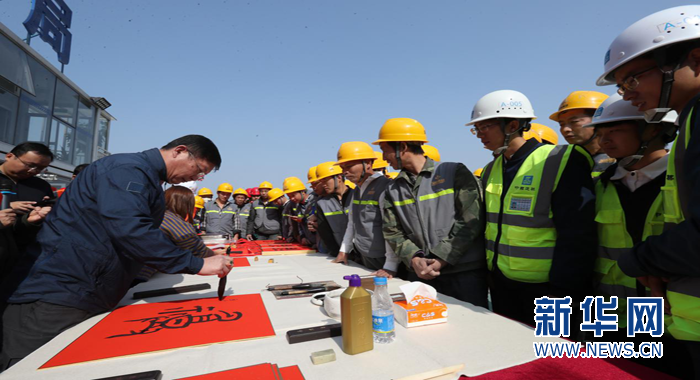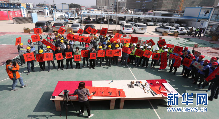王躍慶為建設(shè)者們現(xiàn)場寫“福”字。新華網(wǎng)發(fā)