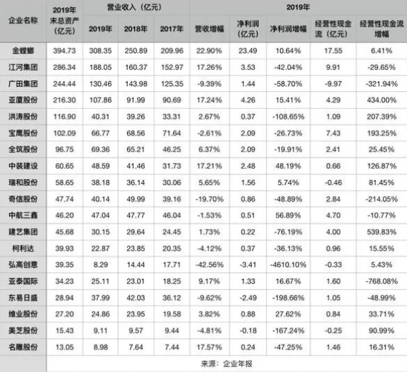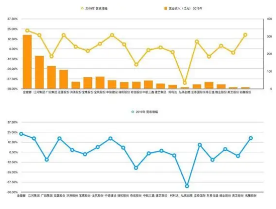 近日,隨著最后一家A股建筑裝飾企業(yè)洪濤股份的年報浮出水面,A股建筑裝飾企業(yè)2019年年報全部公布完畢,業(yè)績增速整體放緩、行業(yè)集中度不斷提升的發(fā)展態(tài)勢一目了然。在本研究報告統(tǒng)計的19家典型樣本A股建筑裝飾企業(yè)中,有的深耕主業(yè),在2019年實現業(yè)績平穩(wěn)增長,有的則出現業(yè)績大幅下滑,甚至出現大額虧損。其中,弘高創(chuàng)意虧損3.41億元,同比下降4610.10%。營收和歸屬于上市公司股東凈利潤(以下簡稱“凈利潤”)雙增長的只有6家,分別為金螳螂、亞廈股份、中裝建設、瑞和股份、亞泰國際、維業(yè)股份。