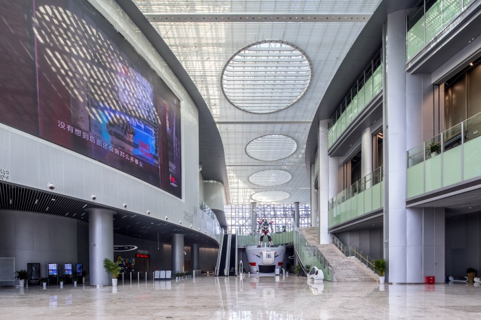 科技館大廳及公共區(qū)域內(nèi)運(yùn)用了大量的夾層設(shè)計(jì),配以超高鋁板立柱和大面積的銀色鋁板幕墻,使空間顯得高大寬敞、開放通透,未來(lái)感和科技感十足。