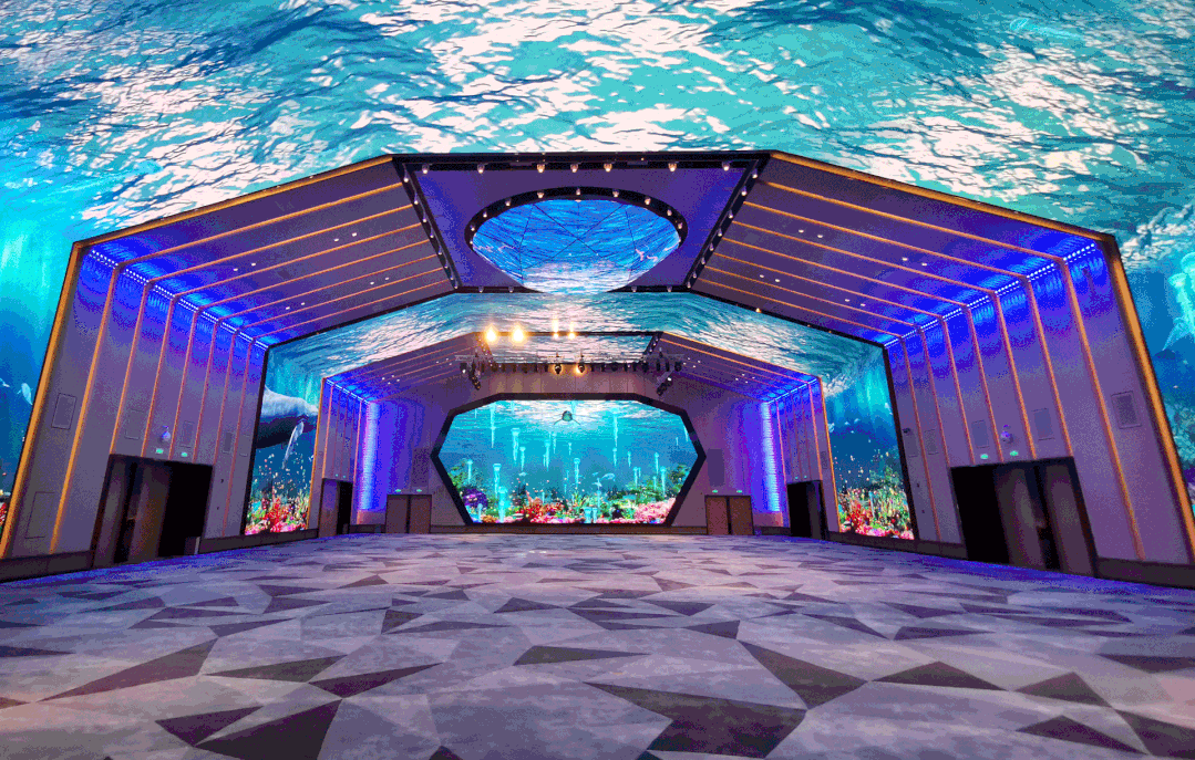 其中,寶鷹負(fù)責(zé)裝飾的商業(yè)宴會(huì)廳,采用全景沉浸式的無(wú)柱設(shè)計(jì),結(jié)合1400平米超大空間、恢弘的動(dòng)態(tài)裸眼3D畫(huà)面、立體環(huán)幕影像展示將實(shí)景與聲線、光影相融一體,呈現(xiàn)出身臨其境的極致感觀體驗(yàn)。