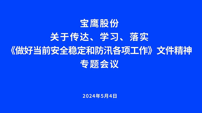 5月4日下午,寶鷹股份召開專題會議,傳達(dá)學(xué)習(xí)貫徹習(xí)近平總書記重要指示精神,貫徹落實李強(qiáng)總理批示要求,落實省、市、珠海國資委及大橫琴集團(tuán)工作部署,迅速部署做好寶鷹股份安全穩(wěn)定和防汛各項工作。