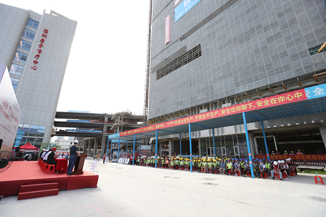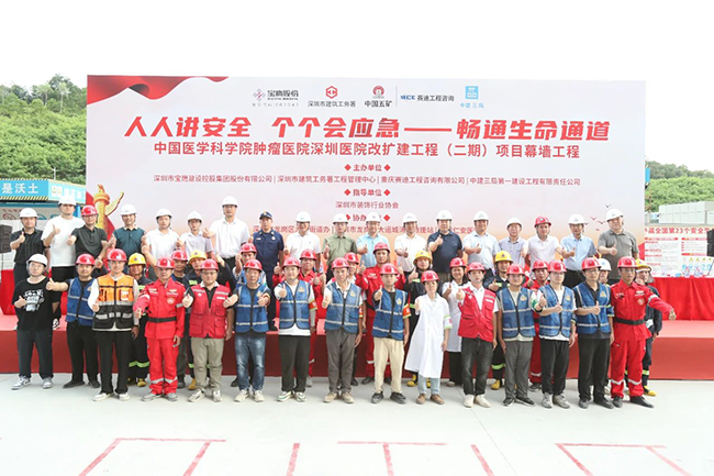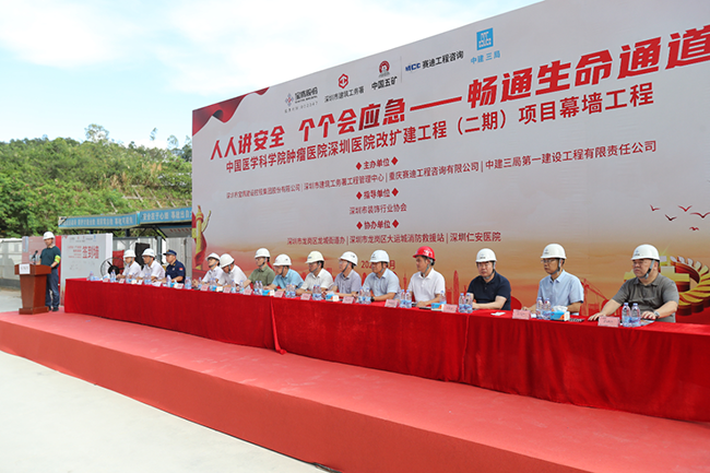 深圳市建筑工務(wù)署工程管理中心副主任符翔、項(xiàng)目工程師殷積彪,深圳市裝飾行業(yè)協(xié)會常務(wù)副會長、總工程師王彥波、培訓(xùn)中心主任莫晉里,深圳市龍崗區(qū)龍城街道辦副主任程俊雄、副主任雷煥雄,深圳市龍崗區(qū)大運(yùn)城消防救援站副站長何明,重慶賽迪工程咨詢有限公司大灣區(qū)分公司總經(jīng)理付光平,中建三局集團(tuán)(深圳)有限公司一公司安全總監(jiān)劉振曉,深圳仁安醫(yī)院常務(wù)副院長吳云劍,深圳市寶鷹建設(shè)集團(tuán)股份有限公司董事長肖家河、副總裁鐘志剛、安全管理部總監(jiān)陳龍、幕墻事業(yè)部總經(jīng)理韓偉杰、公司技術(shù)負(fù)責(zé)人葉石堅(jiān)等相關(guān)領(lǐng)導(dǎo)以及中國醫(yī)學(xué)科學(xué)院腫瘤醫(yī)院深圳醫(yī)院改擴(kuò)建工程(二期)幕墻項(xiàng)目建設(shè)者參加活動。