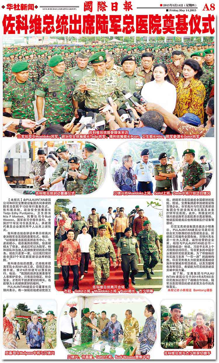 由PULAUINTAN建筑公司和印尼寶鷹建設(shè)集團共同承建位于印尼雅加達的陸軍總醫(yī)院于5月13日下午舉行奠基儀式,佐科維總統(tǒng)、政治安全統(tǒng)籌部長Tedjo Edhy Purdijatno、衛(wèi)生部長Nila F Moeloek、刑警隊司令Budi Waseso,國軍總司令穆爾多科,全國27個軍區(qū)司令員及士兵、承建商代表及企業(yè)家約兩千人出席上述儀式。