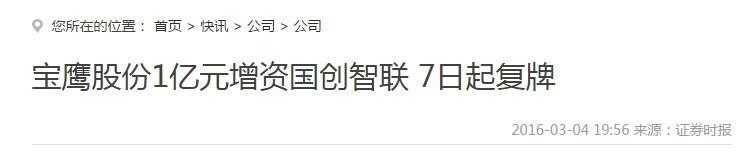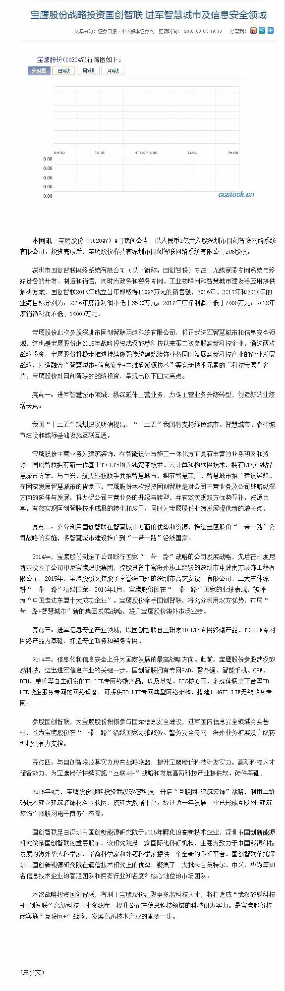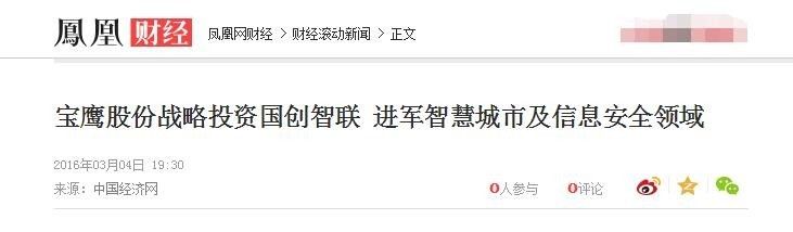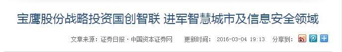 中國(guó)資本證券網(wǎng)報(bào)道《寶鷹股份戰(zhàn)略投資國(guó)創(chuàng)智聯(lián) 進(jìn)軍智慧城市及信息安全領(lǐng)域 》 深入解讀了此次投資事件。