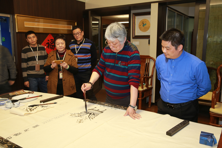 周國城主席揮毫寫蘭花(一)(右一為東莞旗峰山藝術(shù)館館長王躍慶先生,左一為寶鷹集團(tuán)監(jiān)事會主席胡蘭萍女士,右二為寶鷹集團(tuán)副總裁古樸先生)