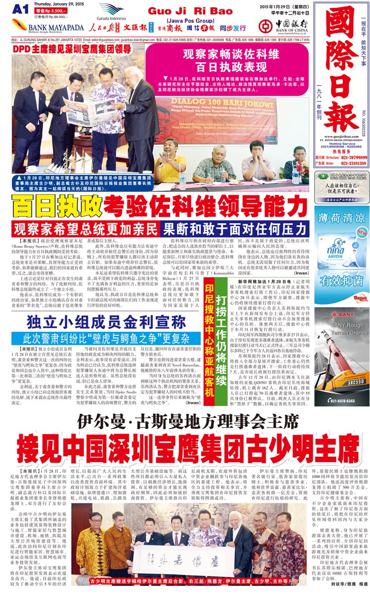 印尼《國際日報》頭版頭條刊載古少明主席一行拜訪印尼地方代表理事會主席伊爾曼·古斯曼