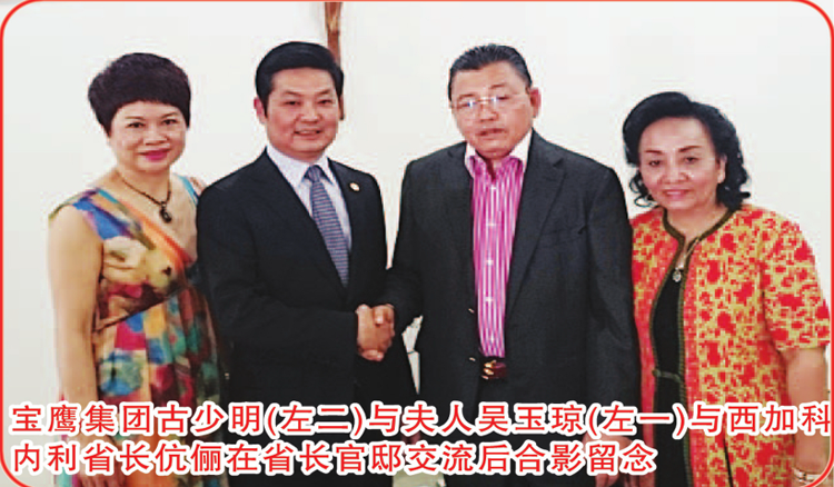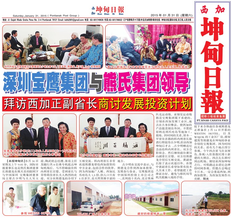 30日上午,古少明主席、夫人吳玉瓊女士一行與熊德龍董事長抵達(dá)坤甸,受到了西加省長科內(nèi)利、夫人菲特莉佳和副省長黃漢山的親切接見。在古少明主席詳細(xì)介紹了寶鷹集團(tuán)概況后,省長科內(nèi)利表示西加非常歡迎中方企業(yè)來西加投資,共同開發(fā)西加豐富的天然資源及建設(shè)公共基礎(chǔ)設(shè)施。副省長則提醒辦好工作準(zhǔn)證,避免與移民局等機(jī)關(guān)發(fā)生抵觸。一行人在坤甸還參觀了熊氏集團(tuán)旗下的Westin Hotel和Wajok的工業(yè)區(qū)廠房。