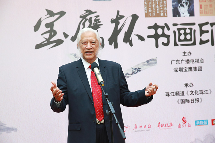 參加此次啟動儀式的主要嘉賓還有國際知名僑領、印尼熊氏集團董事長熊德龍等特邀嘉賓,廣東廣播電視臺副臺長蔡照波,副總編輯楊卓興等主辦方領導,中國美術家協(xié)會副主席、廣東文聯(lián)主席、廣東美術家協(xié)會主席、廣東畫院院長、著名畫家許欽松,中國美術館原副館長、著名美術評論家、書畫家梁江,廣東畫院黨委書記、副院長洪楚平,西泠印社篆刻研究室主任、著名篆刻家、書法家余正,廣東省書法家協(xié)會原副主席、著名畫家、詩人歐廣勇,廣東省書法家協(xié)會原副主席、廣州市美術家協(xié)會主席、西泠印社理事、著名書畫家周國城,廣東省嶺南文化藝術促進基金會書畫藝委會主任、廣州市藝術品行業(yè)商會常務副會長兼書畫藝委會主任、著名書畫鑒定專家、書法家嚴君云,廣東省文物鑒定站鑒定專家、著名書法家、篆刻家潘鳴皋,西泠印社社員、東莞旗峰山博物館名譽館長、著名書法家、篆刻家王躍慶等評委代表。該啟動儀式標志著“寶鷹杯”國際書畫印創(chuàng)作大賽正式拉開帷幕。