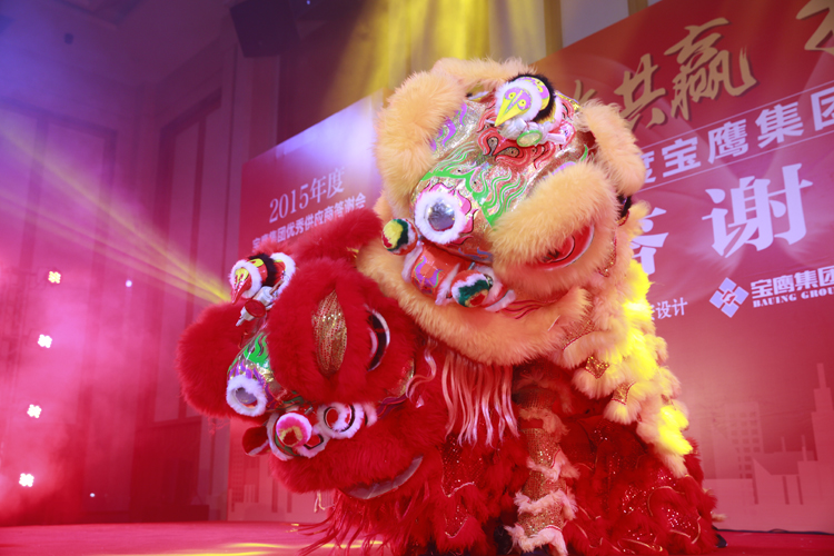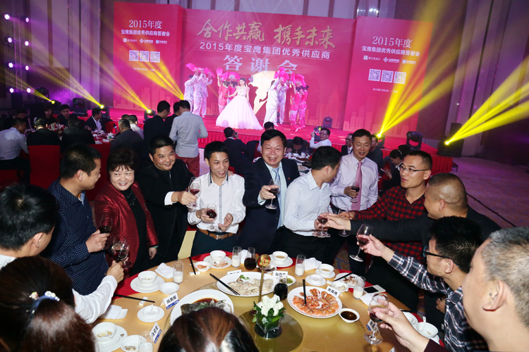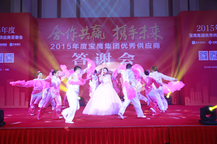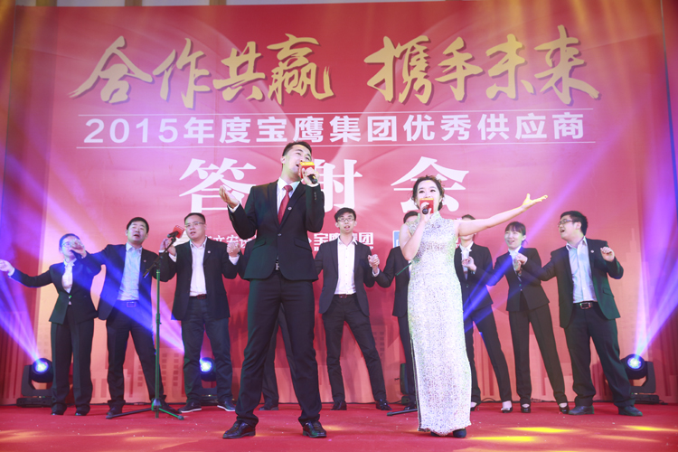 在諸位供應(yīng)商與三方領(lǐng)導(dǎo)一起舉杯,滿飲此杯時,2015寶鷹集團優(yōu)秀供應(yīng)商答謝會晚宴正式開始。一曲曲深情的歌兒唱出溫馨的祝福,一支支優(yōu)美的舞蹈跳出一個前程錦繡。熱鬧非凡的舞獅表演象征著紅紅火火,《今宵如此美麗》的曼妙歌聲讓諸位嘉賓流連忘返,《相親相愛的一家人》訴說著濃濃的情意,《大展宏圖》則傳遞出對未來的雄心壯志。參會嘉賓與諸位領(lǐng)導(dǎo)一邊觀賞著精彩的節(jié)目,一邊為友誼和新的希望舉杯,現(xiàn)場沉浸在一派活潑熱鬧的氣氛中。值得一提的是,本次供應(yīng)商答謝會加入了嘉賓點歌環(huán)節(jié),諸位嘉賓分別用歌唱表達著自己心中的喜悅,亦為此次供應(yīng)商答謝會畫上了圓滿的句號。