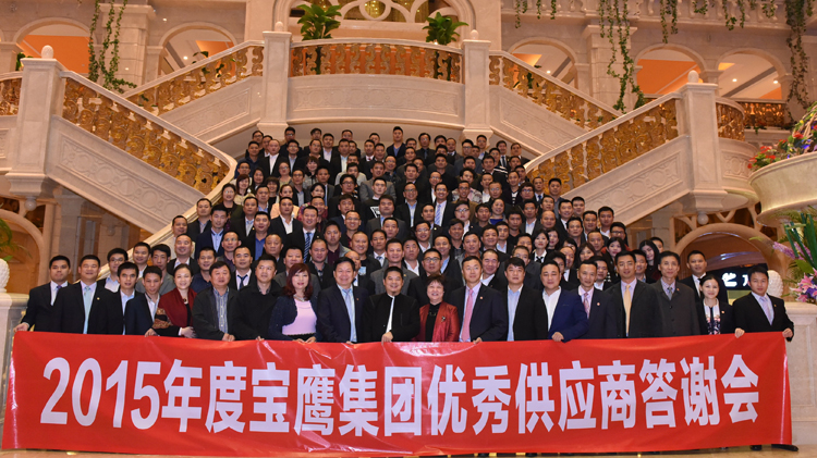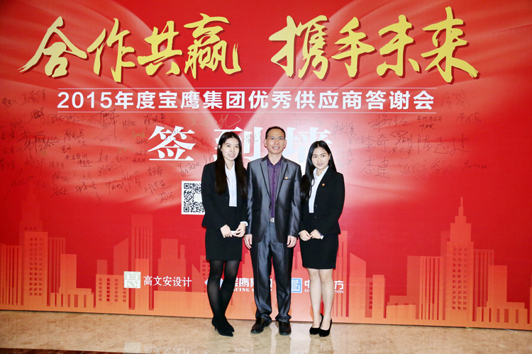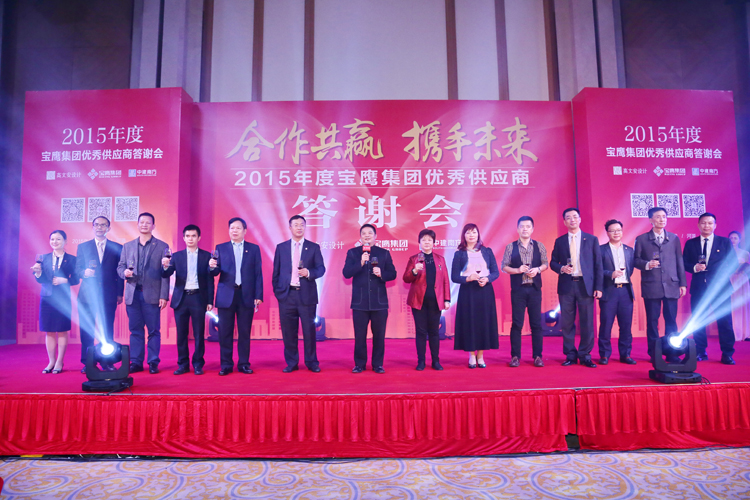 答謝會上,寶鷹集團總裁成湘文對各位優(yōu)秀供應(yīng)商代表的到來表示熱烈歡迎,并向在2015年對寶鷹集團、中建南方和高文安設(shè)計的事業(yè)給予莫大支持和幫助的各位朋友表示衷心的感謝。成湘文總裁說:寶鷹集團在2015年里延續(xù)2014年的穩(wěn)健步伐,在提升主營業(yè)務(wù)的同時不斷打開格局,以更積極的姿態(tài)踐行“互聯(lián)網(wǎng)+”戰(zhàn)略和“一帶一路”戰(zhàn)略。2015年,寶鷹集團順勢而為,成功牽手全球知名室內(nèi)設(shè)計品牌——高文安設(shè)計,打響了“以設(shè)計帶動施工”發(fā)展戰(zhàn)略。2015年,寶鷹集團把握大勢,果敢入股二維碼行業(yè)領(lǐng)導(dǎo)者——武漢矽感,再次深耕“互聯(lián)網(wǎng)+”行業(yè)。2015年,寶鷹集團文化開路,奮翅海外,在“一帶一路”上愈行愈遠。斐然的成績離不開集團領(lǐng)導(dǎo)班子的正確決策,離不開每一位寶鷹人的不竭努力,更離不開各位供應(yīng)商對寶鷹集團日繼一日的大力支持。我們未來還有著更廣闊的合作深度和合作層次,寶鷹集團將一直堅持誠信經(jīng)營,共贏經(jīng)商的合作理念,高度重視合作伙伴利益,在新時代下繼續(xù)引領(lǐng)行業(yè),創(chuàng)造輝煌。