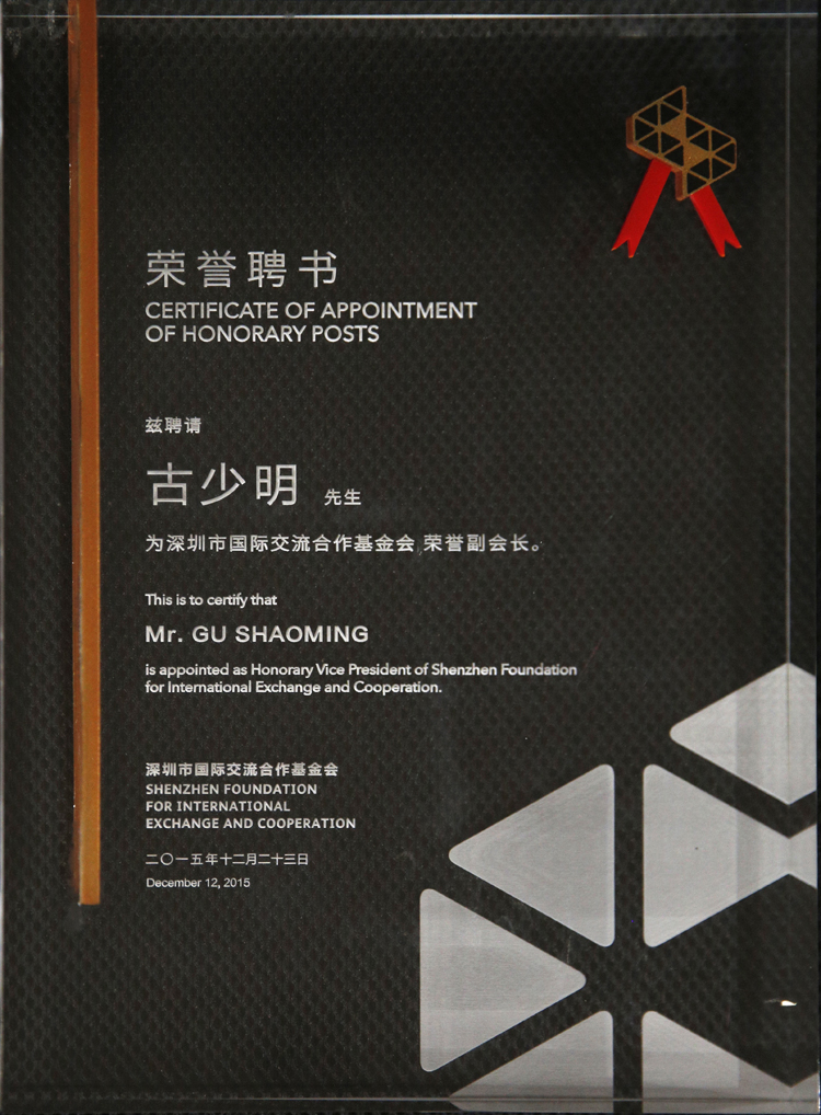 2015年12月23日晚,“問計天下深士”沙龍暨深圳市國際交流合作基金會周年活動于深圳東海朗廷酒店舉辦,因在國際交流尤其是一帶一路經(jīng)貿合作與文化交流中的突出貢獻,寶鷹集團董事局主席古少明被聘為深圳市國際交流合作基金會榮譽副會長,寶鷹集團副總裁古樸受古少明主席委托代為出席并領取聘書。
