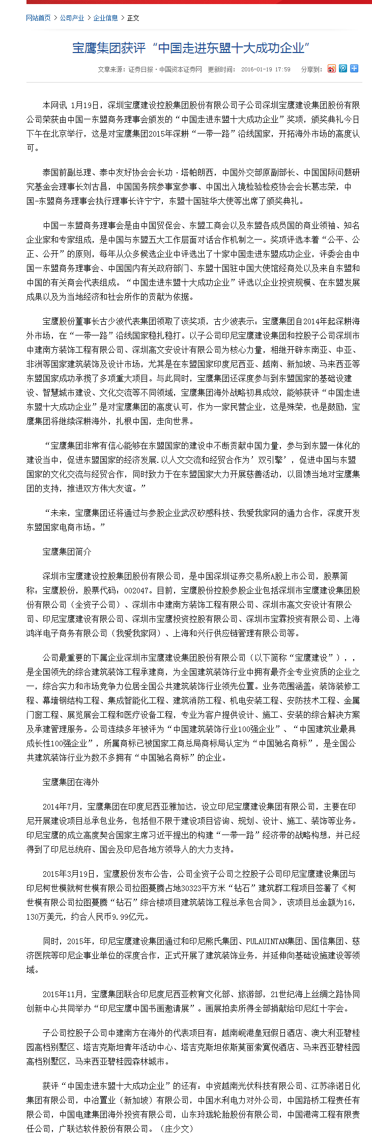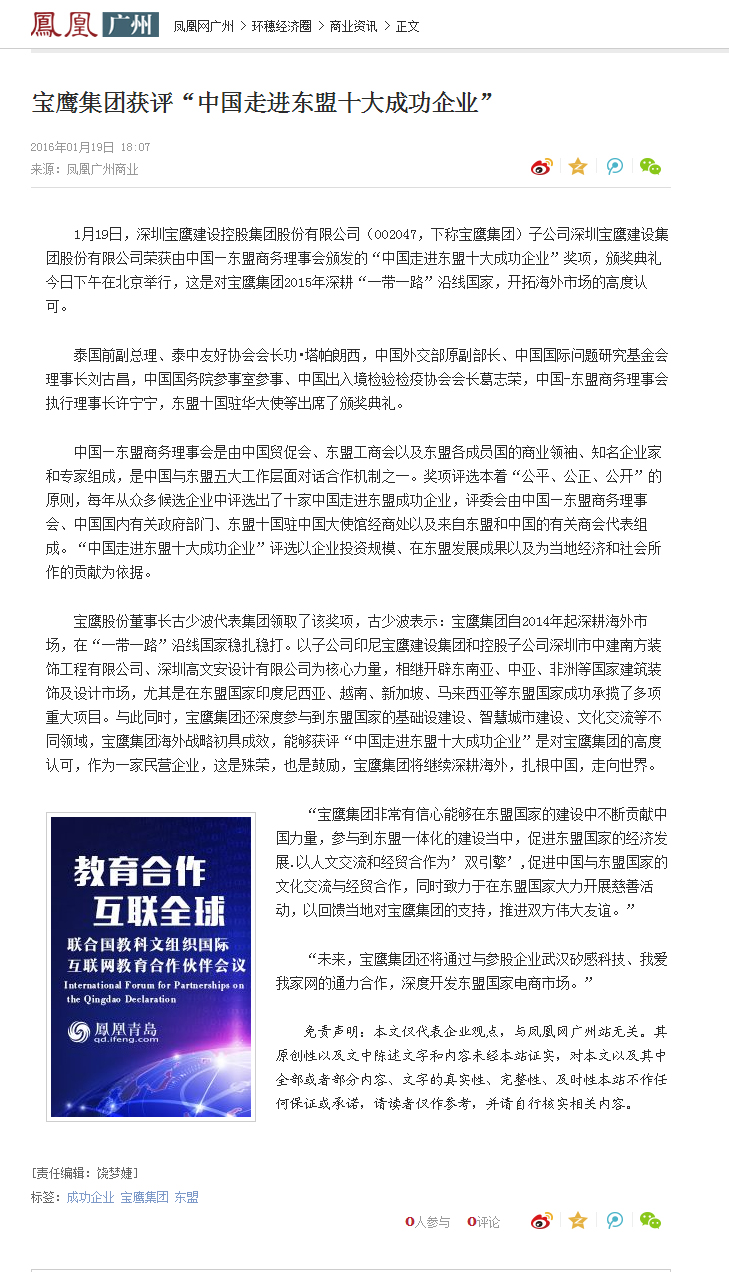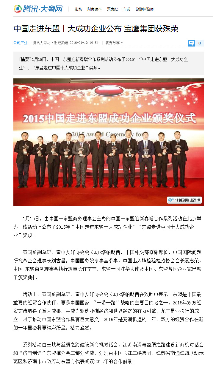 1月19日,由中國—東盟商務(wù)理事會(huì)、東盟北京委員會(huì)主辦的中國—東盟迎新春增合作系列活動(dòng)在北京舉辦,活動(dòng)上公布了2015年“中國走進(jìn)東盟十大成功企業(yè)”“東盟走進(jìn)中國十大成功企業(yè)”獎(jiǎng)項(xiàng)。深圳寶鷹集團(tuán)(股票代碼:002047)因在“一帶一路”沿線國家特別是東盟國家中的突出表現(xiàn)而獲評“2015中國走進(jìn)東盟十大成功企業(yè)”。