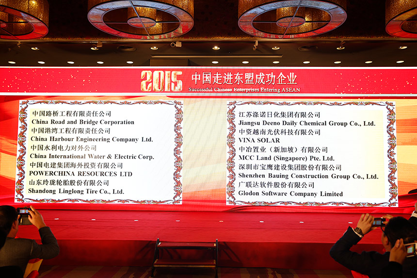 頒獎(jiǎng)環(huán)節(jié),緬甸駐華大使蒂林翁宣讀“2015中國走進(jìn)東盟十大成功企業(yè)”名單。獲評“2015中國走進(jìn)東盟十大成功企業(yè)”的有:中資越南光伏科技有限公司、深圳寶鷹建設(shè)集團(tuán)股份有限公司、江蘇滌諾日化集團(tuán)有限公司、中冶置業(yè)(新加坡)有限公司、中國水利電力對外公司、中國路橋工程責(zé)任有限公司、中國電建集團(tuán)海外投資有限公司、山東玲瓏輪胎股份有限公司、中國港灣工程有限責(zé)任公司、廣聯(lián)達(dá)軟件股份有限公司。其中,中字頭企業(yè)占據(jù)6家。
