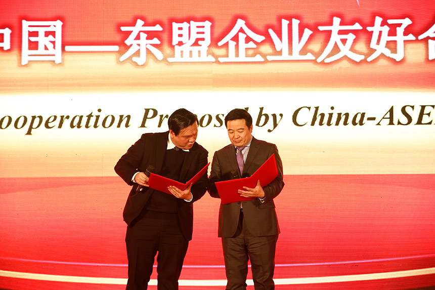 ▲中國與東盟企業(yè)代表一起宣讀《2016中國—東盟企業(yè)友好合作倡議書》