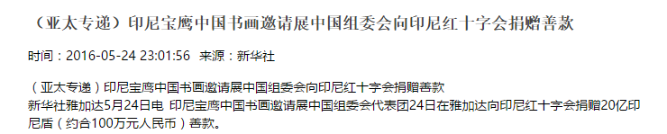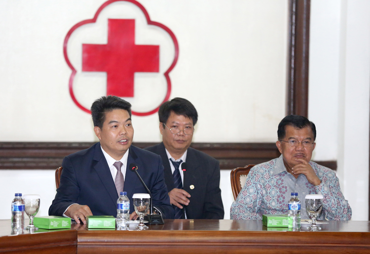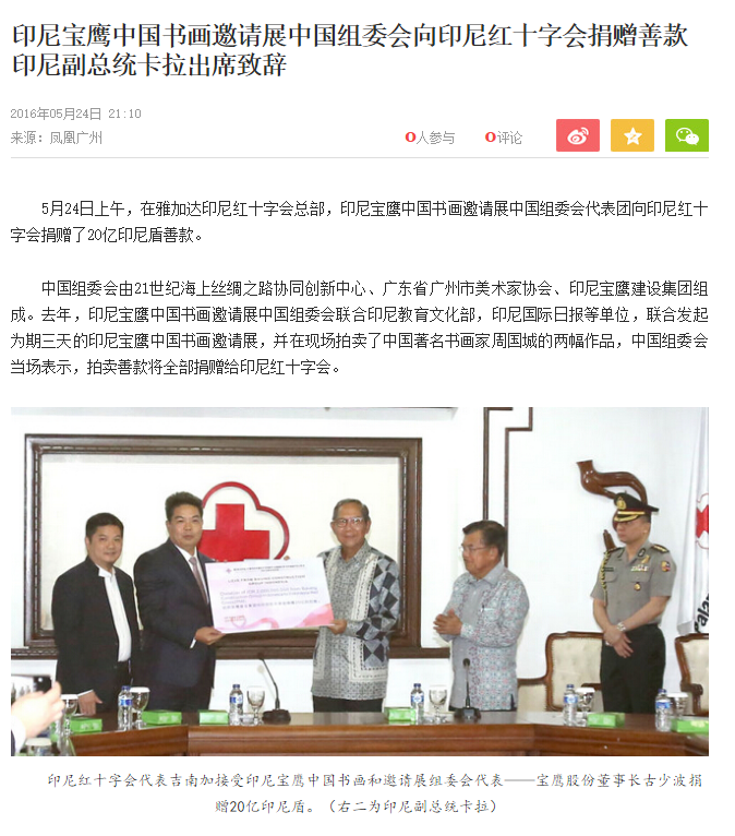 5月24日上午,在雅加達印尼紅十字會總部,寶鷹股份董事長古少波代表印尼寶鷹中國書畫邀請展中國組委會向印尼紅十字會捐贈了20億印尼盾善款。印尼副總統(tǒng)、印尼紅十字會總主席卡拉見證捐贈并發(fā)表致辭。