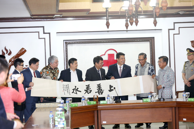 ▲印尼寶鷹中國書畫邀請展中國組委會向印尼副總統(tǒng)尤素夫·卡拉贈送“上善若水”書法作品
