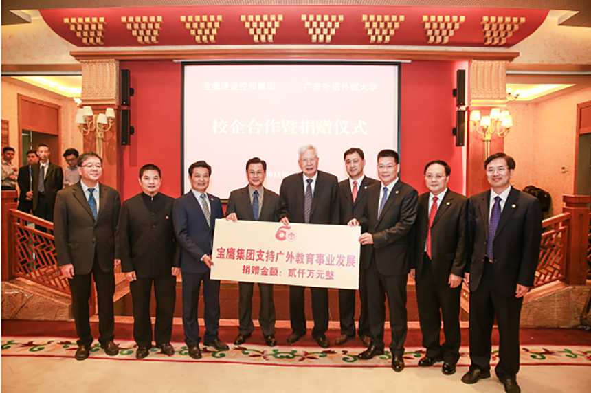 廣東外語(yǔ)外貿(mào)大學(xué)建校50周年之際,寶鷹集團(tuán)與廣外建立校企合作關(guān)系,雙方將在資源、 技術(shù)、 師資培養(yǎng)、 學(xué)生就業(yè)、科研活動(dòng)等方面精誠(chéng)合作,最終實(shí)現(xiàn)校企雙贏的人才培養(yǎng)模式。期間寶鷹實(shí)業(yè)集團(tuán)向廣東外語(yǔ)外貿(mào)大學(xué)捐款人民幣2000萬(wàn)元,用于發(fā)展廣東外語(yǔ)外貿(mào)大學(xué)的教育事業(yè)。