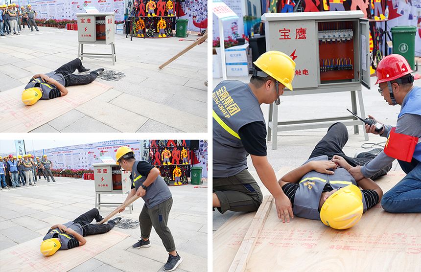 在隨后的工人觸電事故模擬現(xiàn)場(chǎng),當(dāng)觸電事故發(fā)生時(shí),發(fā)現(xiàn)事故的工人首先切斷電源,用木條拉開電線分離觸電人員,讓其平躺并呼叫救援。