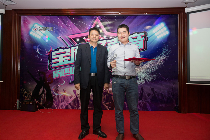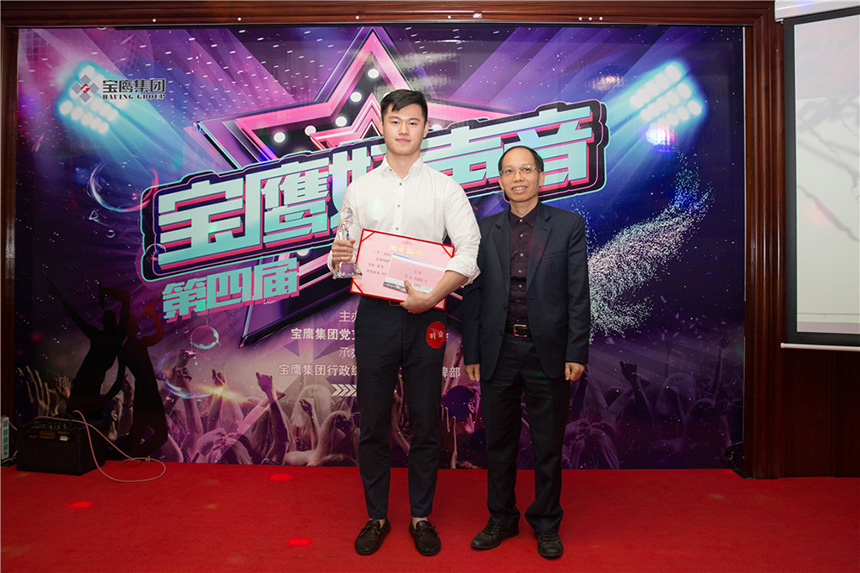 ▲寶鷹集團(tuán)總裁成湘文為冠軍獲得者工程綜合部朱暉頒獎(jiǎng)