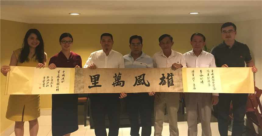 ▲寶鷹集團(tuán)副總裁古樸(左三)向柬埔寨國(guó)家警察總署副總長(zhǎng)查哈利特將軍(左四)贈(zèng)送西泠社人、寶鷹美術(shù)館館長(zhǎng)王躍慶書法作品《雄風(fēng)萬(wàn)里》