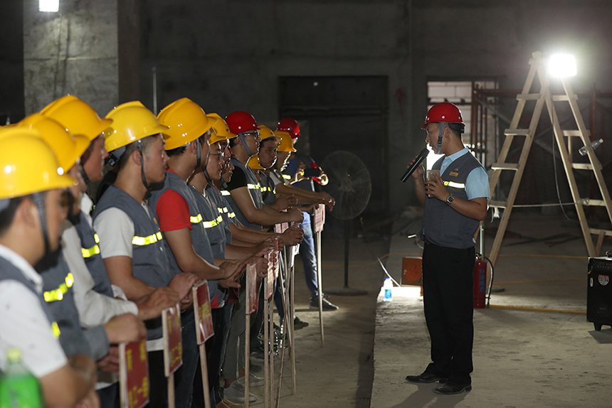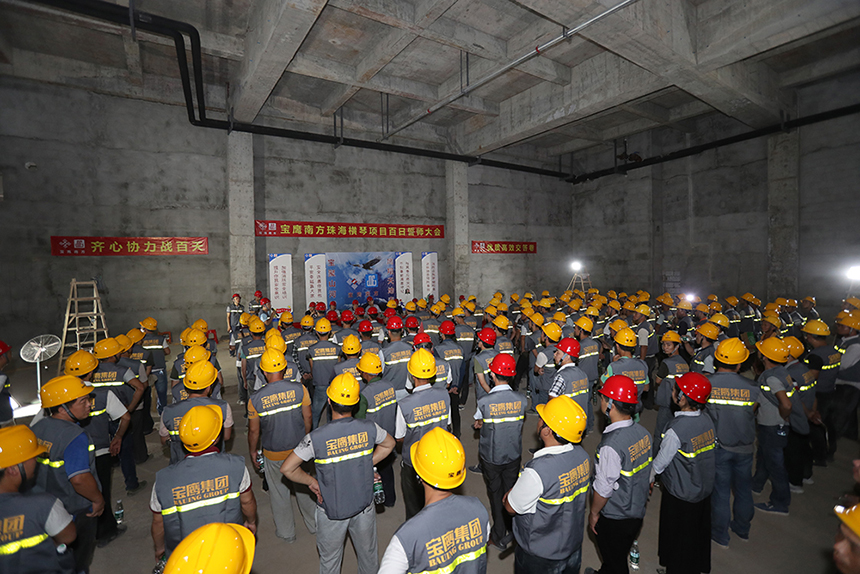 珠海橫琴星藝文創(chuàng)天地項(xiàng)目工序多、工程量大,存在著多工種、多工序的交叉作業(yè),對(duì)施工形成極大的考驗(yàn)。早在項(xiàng)目招標(biāo)時(shí),甲方就對(duì)工程進(jìn)度和質(zhì)量提出了嚴(yán)格要求:施工單位必須嚴(yán)格遵守甲方提出的各項(xiàng)質(zhì)量標(biāo)準(zhǔn),且必須在八月初保質(zhì)保量完成。針對(duì)這一現(xiàn)實(shí)情況,寶鷹集團(tuán)立即組建保質(zhì)量、保工期工作小組,積極部署項(xiàng)目建設(shè),并召開此次安全培訓(xùn)暨百日攻堅(jiān)誓師大會(huì),以保障項(xiàng)目如期高質(zhì)量完工。