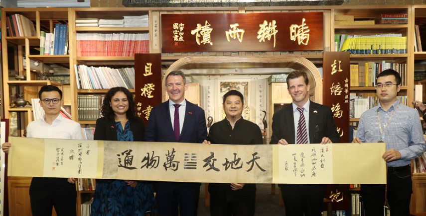▲寶鷹集團常務副總裁古樸贈與澳大利亞北領地洲政府省長邁克爾· 剛納(Hon Michael Gunner MLA)寶鷹美術館館長王躍慶書法作品“天地交 萬物通”
