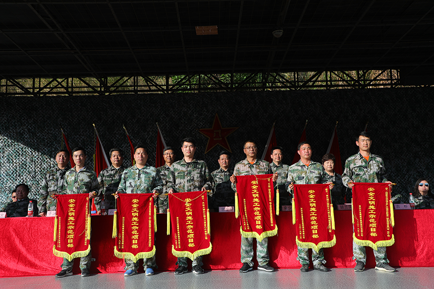 ▲深圳裝飾協(xié)會會長高剛,寶鷹集團(tuán)董事局主席古少明,寶鷹股份董事長古少波為“安全文明施工示范項(xiàng)目部”頒獎