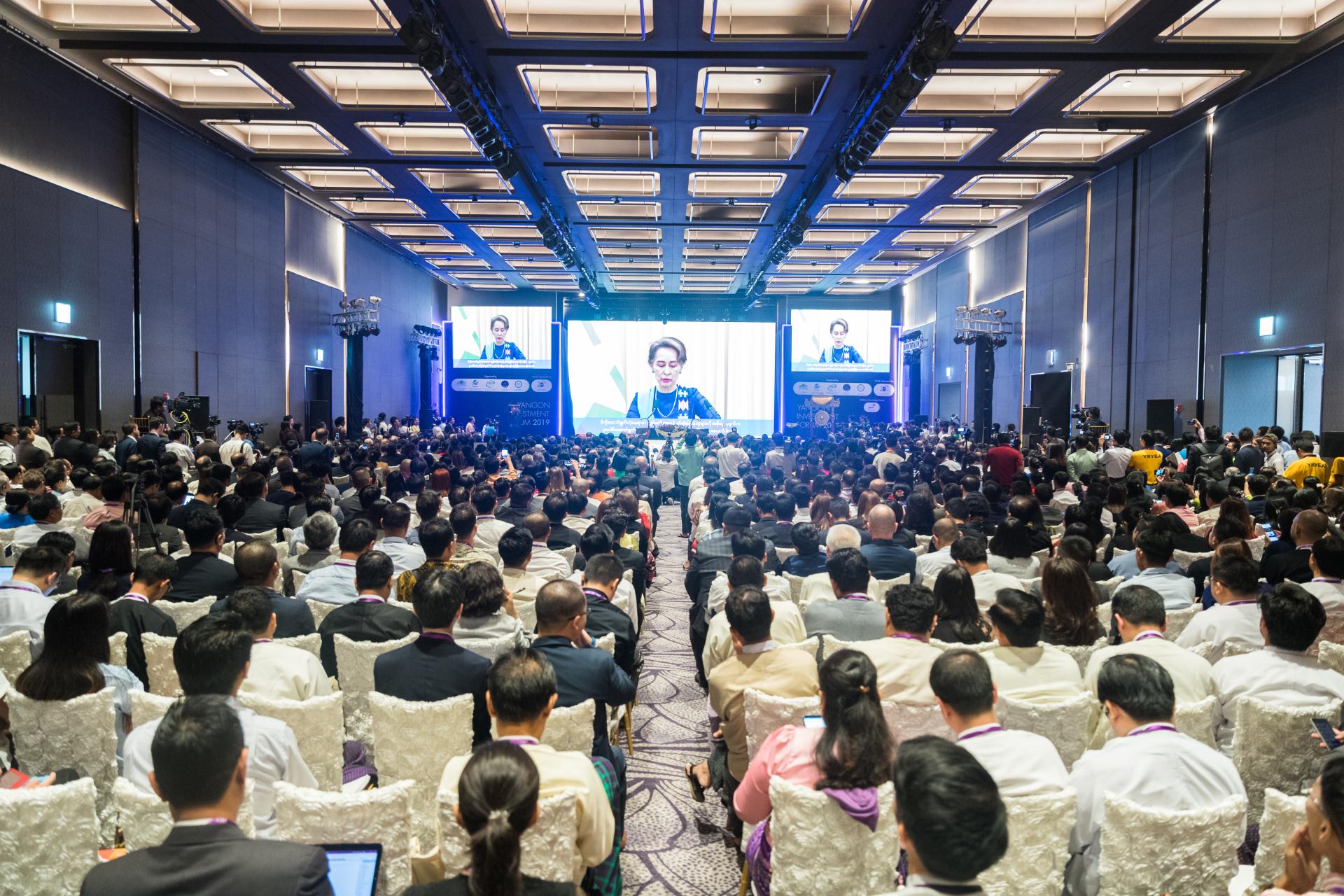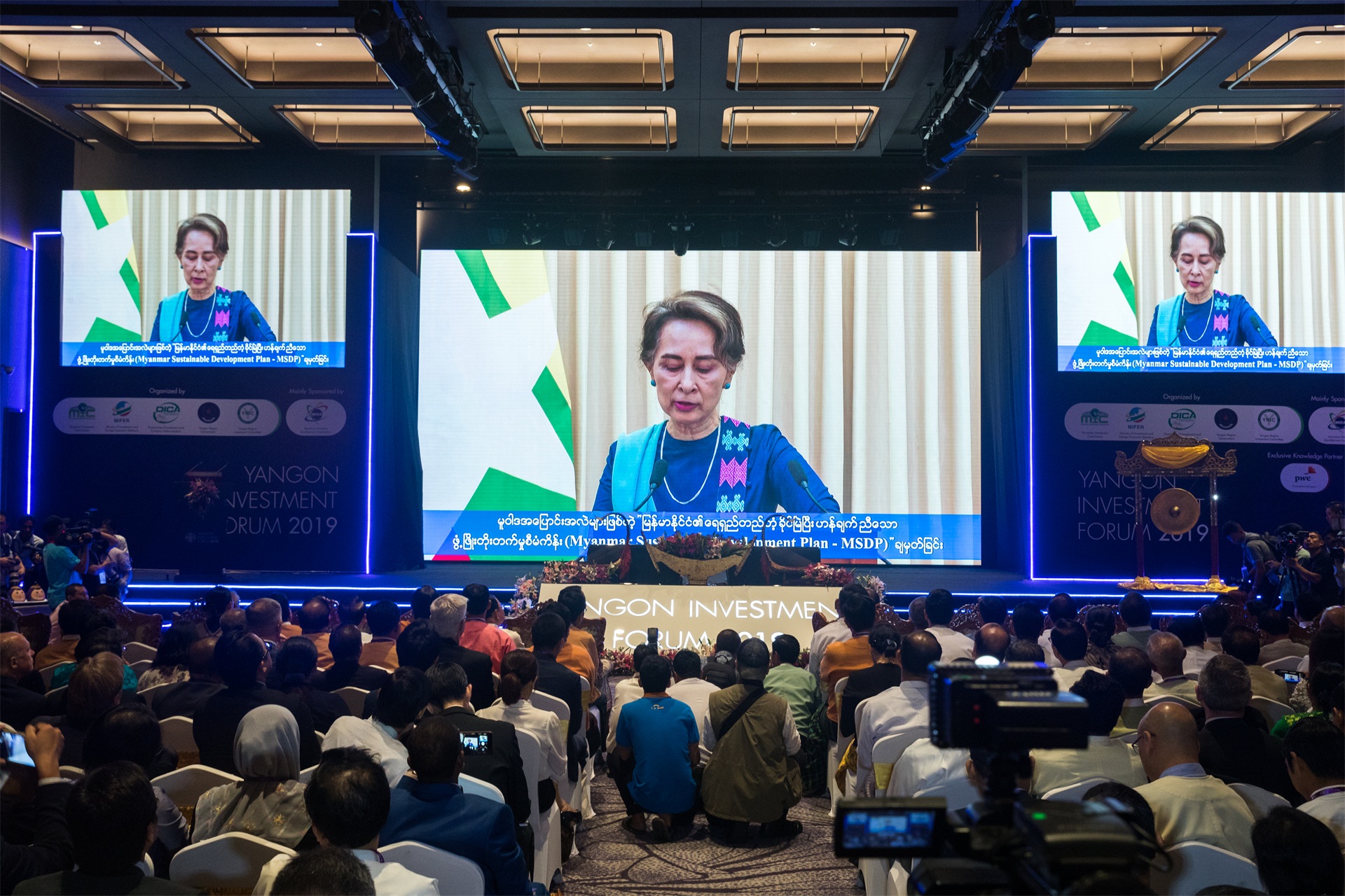 國(guó)務(wù)資政昂山素季為論壇發(fā)表視頻致辭。緬甸投資和對(duì)外經(jīng)濟(jì)關(guān)系部聯(lián)邦部長(zhǎng)兼緬甸投資委員會(huì)主席吳當(dāng)吞(U Thaung Tun)宣布論壇開幕。