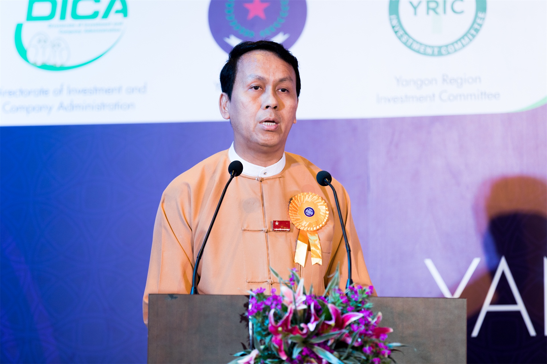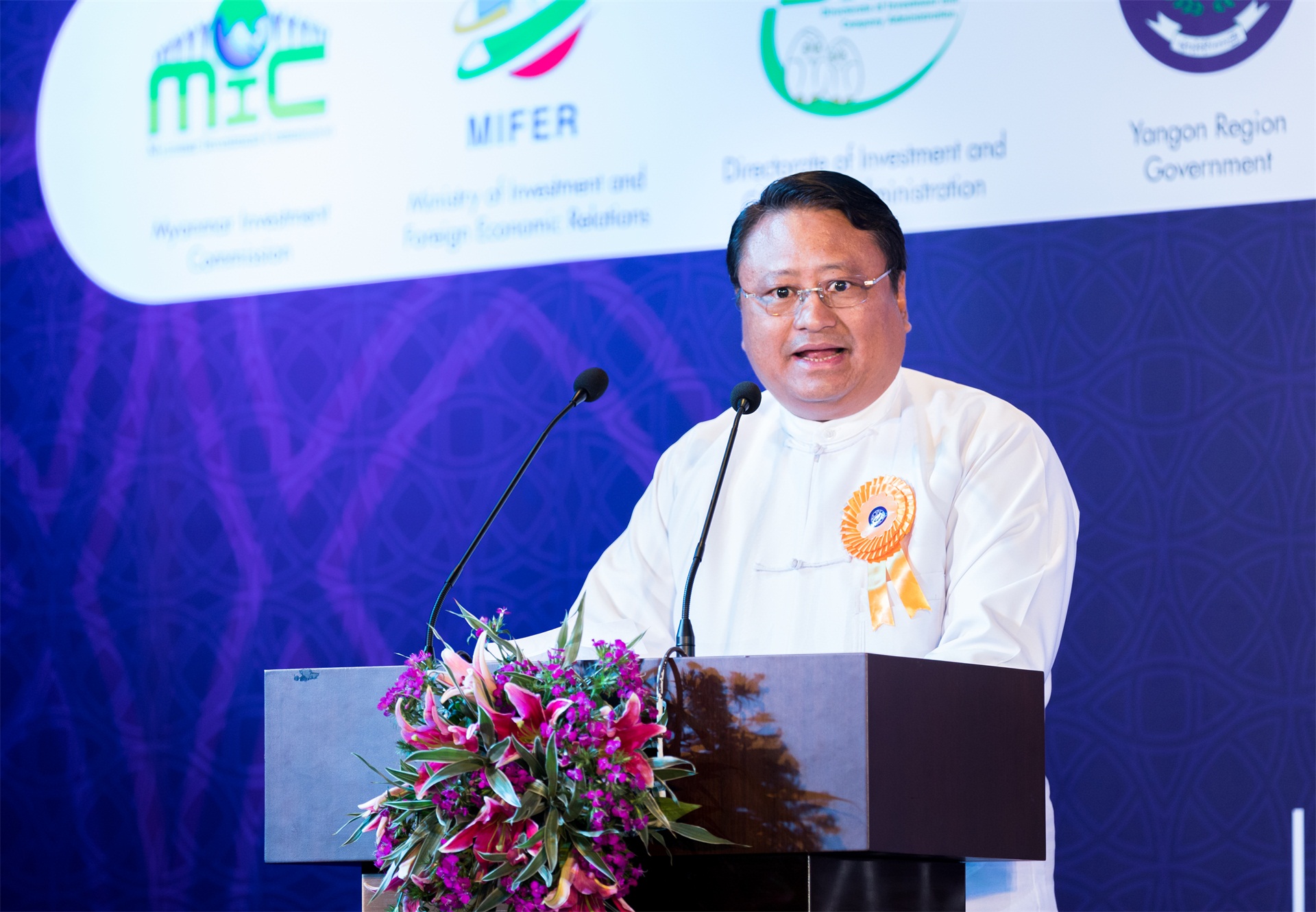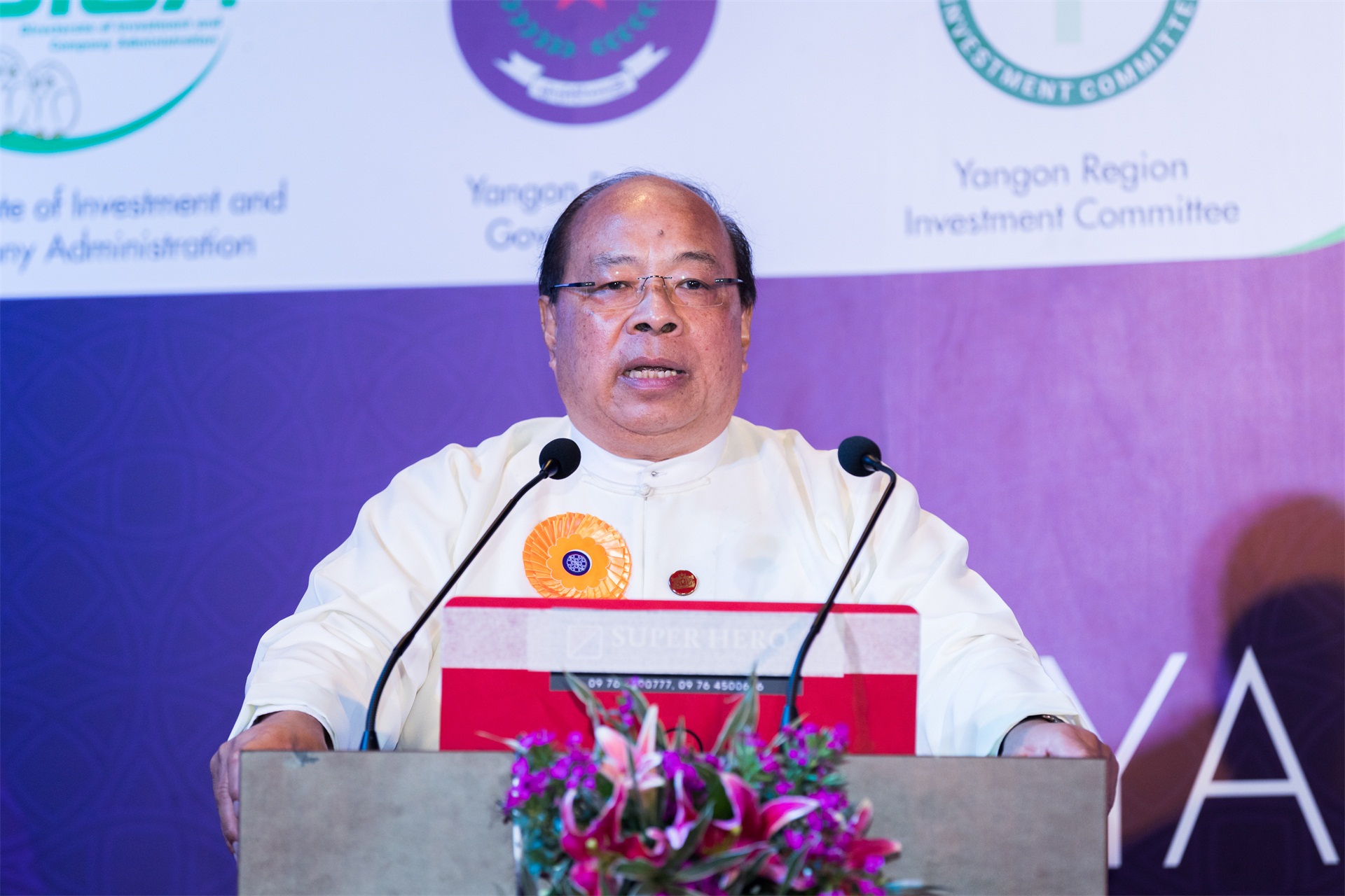 ▲ 緬甸仰光省政府省長(zhǎng)吳漂敏登(U Phyo Min Thein)致辭并表示希望把仰光省打造成世界上最吸引外資來投資的中心地帶