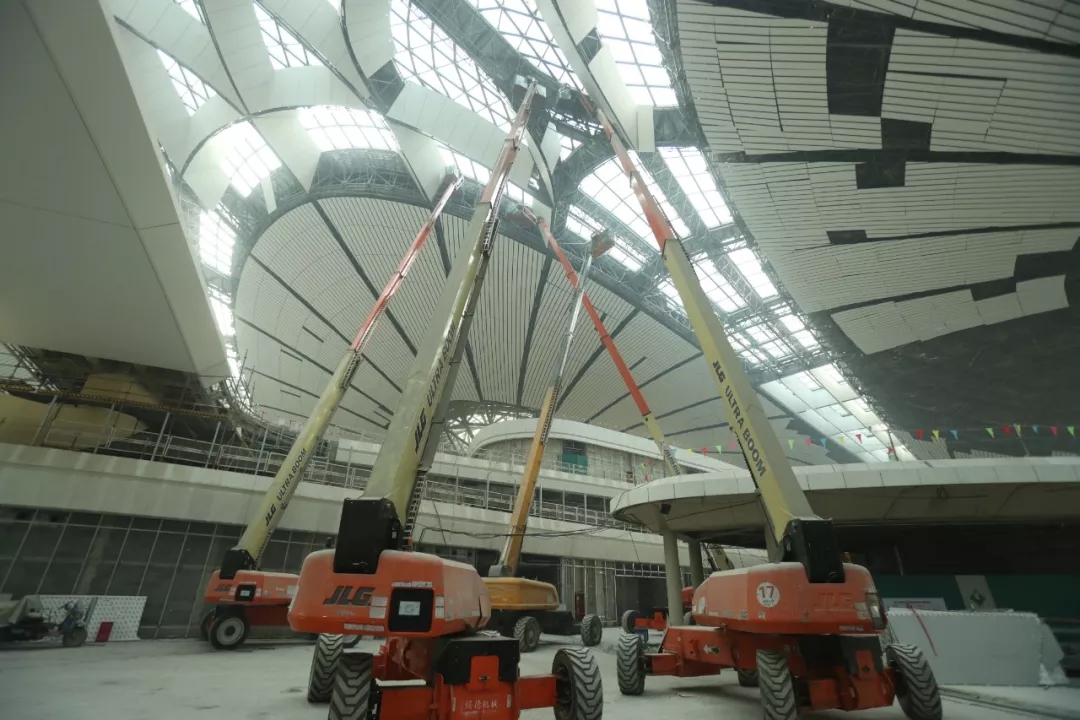 啟運儀式畫面正后方懸掛五星紅旗處,正是寶鷹集團參建標段,該標段也是北京大興國際機場精裝修最核心區(qū)域、最大最受關(guān)注標段。主要為機場核心區(qū)二層(峽谷區(qū))采光頂、指廊天窗、大吊頂、C型柱、扶梯、商業(yè)浮島、公共衛(wèi)生間、中央水池、羅盤箱、板邊GRG、地面石材等范圍施工,地面覆蓋面積約3.6萬平米。