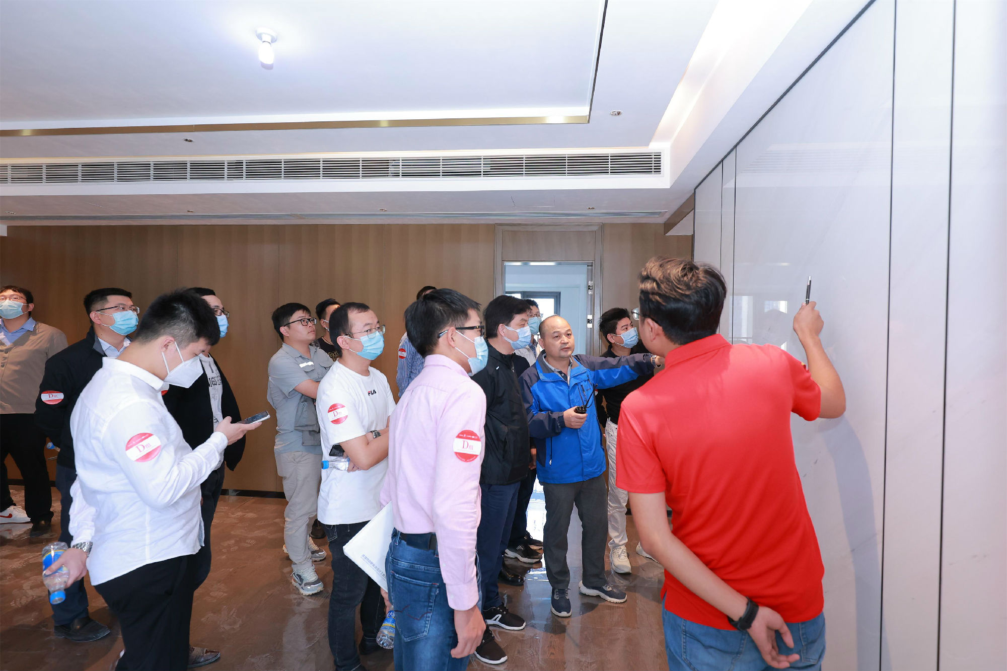 本次觀摩會以“匠心打造行業(yè)標桿,品質引領精裝發(fā)展”為主題,旨在加強建筑裝飾企業(yè)間技術交流,提升行業(yè)批量精裝修業(yè)務能力,弘揚工匠精神,引領精裝發(fā)展。項目現場,與會人員先后觀摩了精裝樣板間和工序樣板間,詳細了解了油漆、燈槽、卡式龍骨吊頂、地面石材鋪貼施工安裝工藝以及全過程實測實量等相關內容。