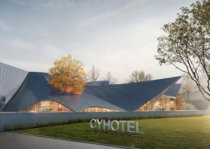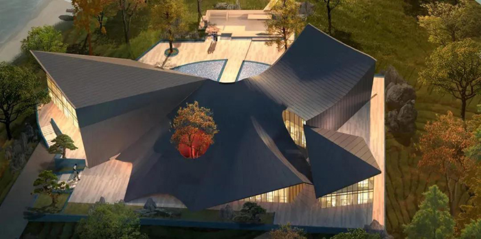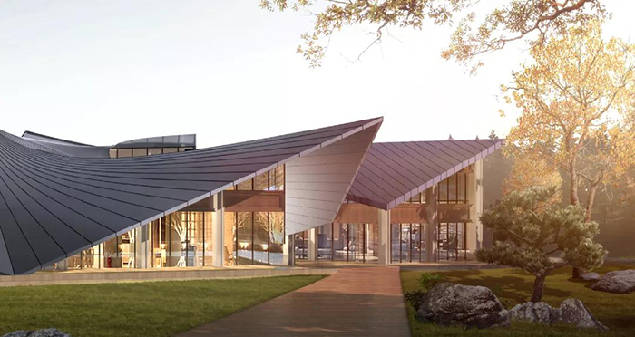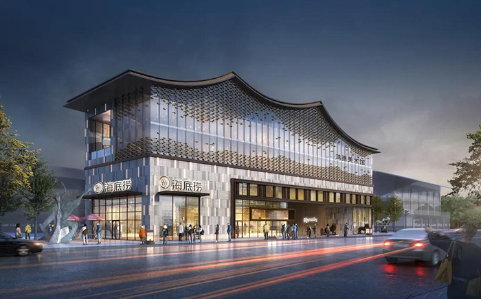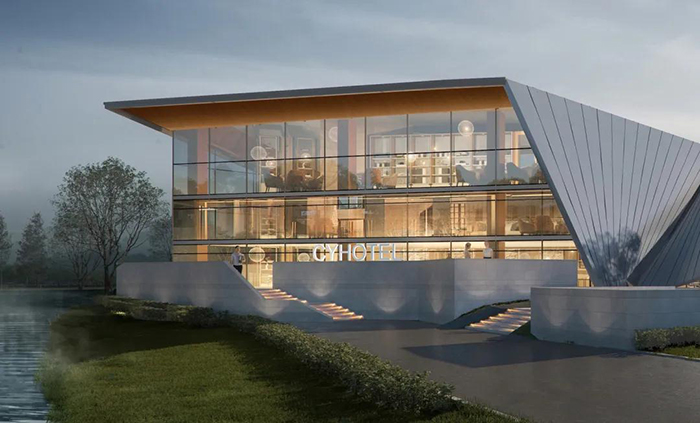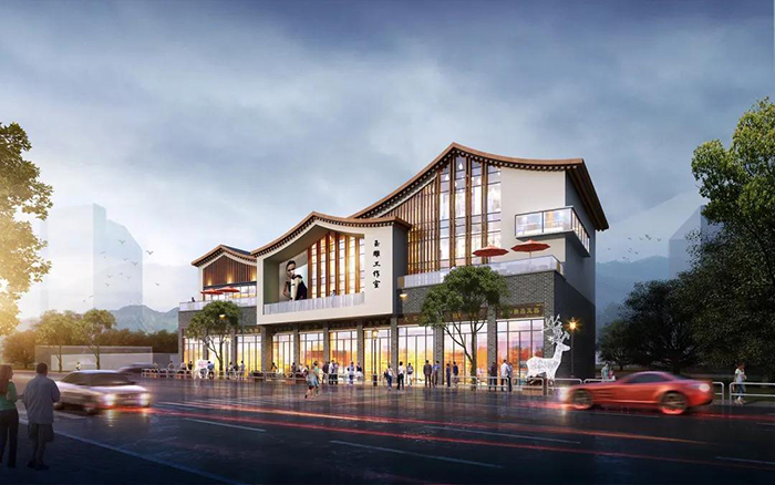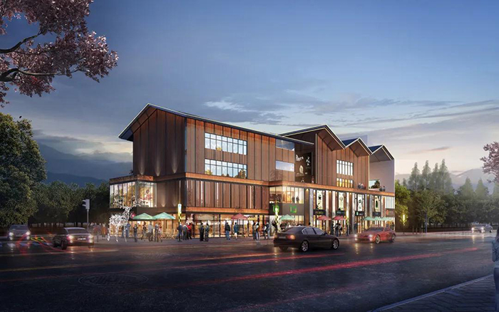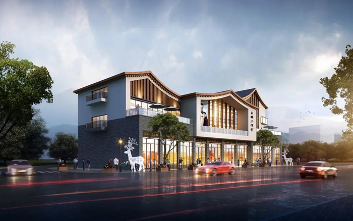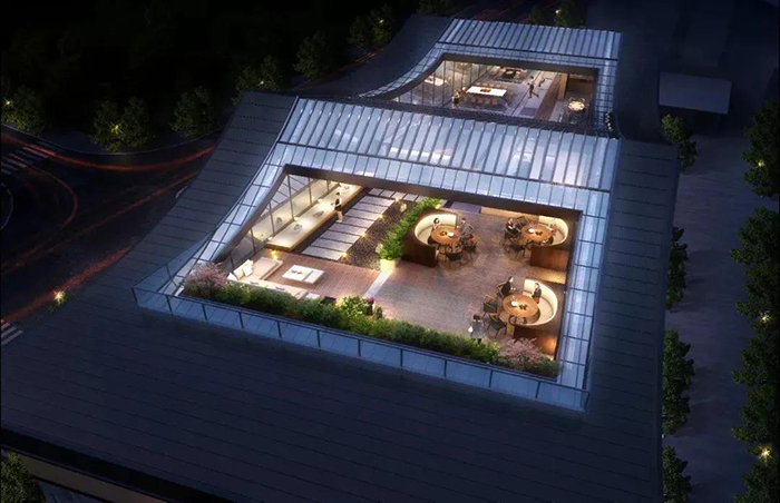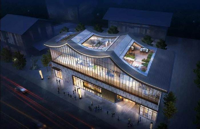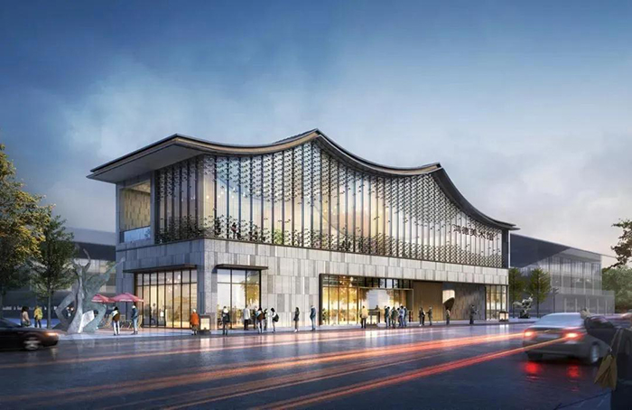 建筑整體采用玻璃幕墻+千紙鶴構(gòu)件、格柵結(jié)合仿石材紋理PU磚、實(shí)墻和落地玻璃櫥窗,形成從虛到實(shí)的變化關(guān)系,使得層疊層次更為豐富。人字坡檐在結(jié)合立面和地形向南北延伸,整體比例更加穩(wěn)重大氣。