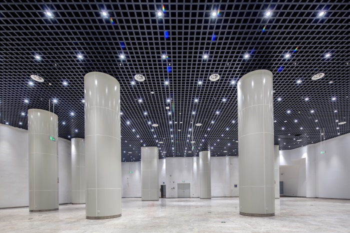 林立在各處的立柱,最高的有21.75m,直徑達(dá)1.6m。立柱與鋁板的垂直高度、拼接縫橫豎對(duì)齊,使場(chǎng)館整體高端大氣,科技感十足。