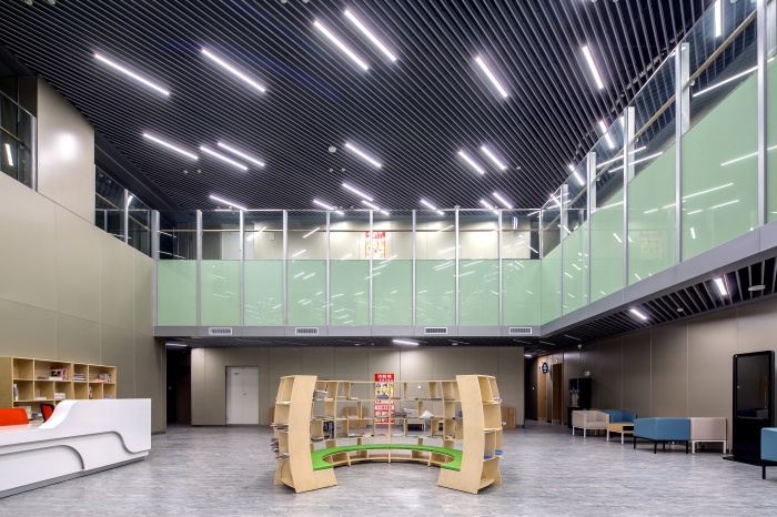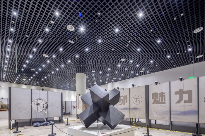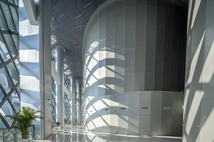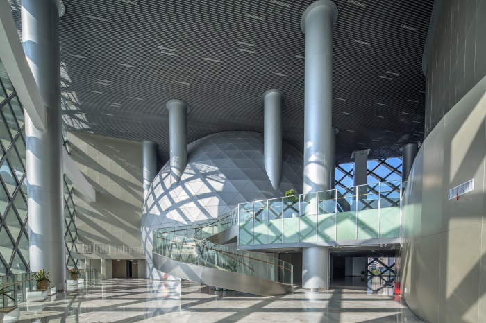 科技館大廳及公共區(qū)域內(nèi)運(yùn)用了大量的夾層設(shè)計(jì),配以超高鋁板立柱和大面積的銀色鋁板幕墻,使空間顯得高大寬敞、開放通透,未來(lái)感和科技感十足。