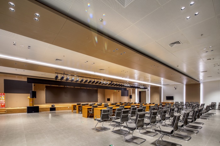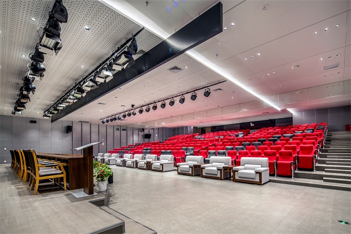 科普?qǐng)?bào)告廳和科普劇場(chǎng)采用科技、簡(jiǎn)約的裝飾風(fēng)格,注重其使用性。鋁板墻面、吊頂與場(chǎng)館的整體風(fēng)格相一致,整齊統(tǒng)一。場(chǎng)館是舉辦“科普大講堂”和“科普互動(dòng)劇”表演的主要場(chǎng)所。