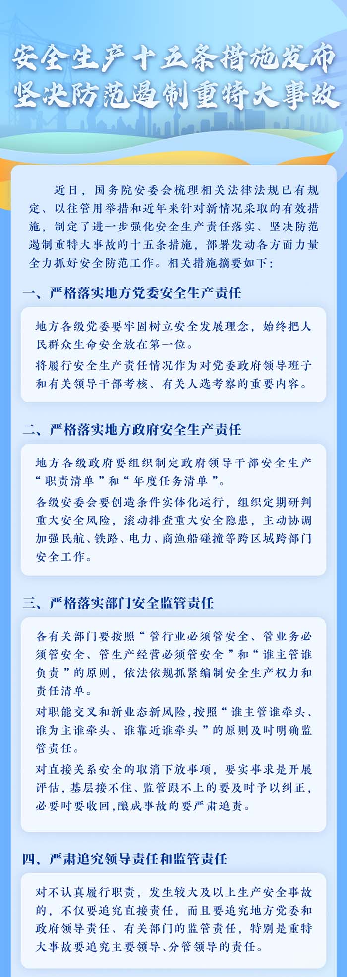 國務(wù)院安委辦有關(guān)負(fù)責(zé)人介紹,國務(wù)院安委會(huì)梳理相關(guān)法律法規(guī)已有規(guī)定、以往管用舉措和近年來針對(duì)新情況采取的有效措施,制定了進(jìn)一步強(qiáng)化安全生產(chǎn)責(zé)任落實(shí)、堅(jiān)決防范遏制重特大事故的十五條措施,部署發(fā)動(dòng)各方面力量全力抓好安全防范工作。