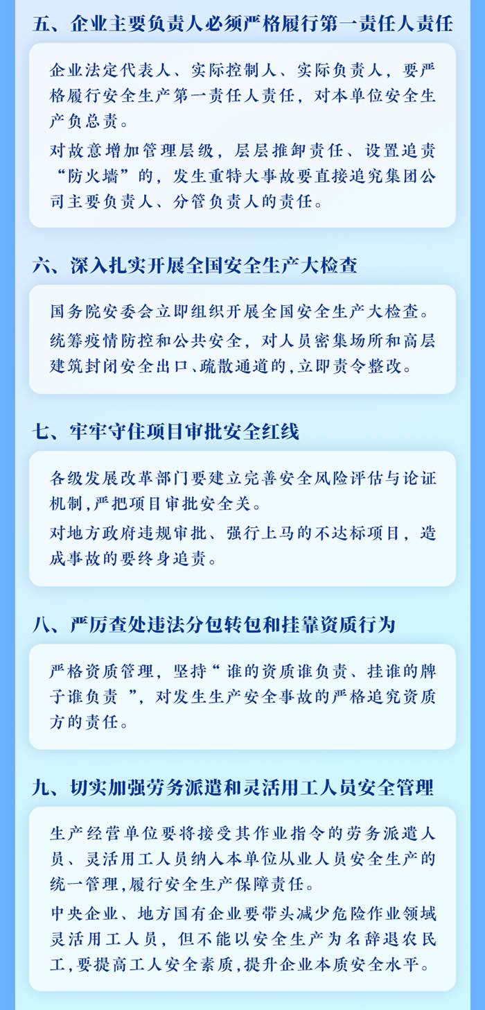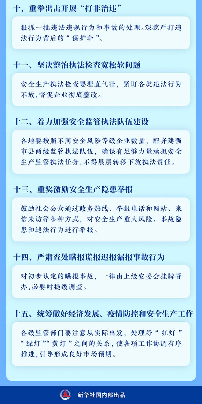 據(jù)介紹,安全生產(chǎn)十五條措施規(guī)定,國務(wù)院安委會(huì)立即組織開展全國安全生產(chǎn)大檢查。各地區(qū)各有關(guān)部門要全面深入排查重大風(fēng)險(xiǎn)隱患,列出清單、明確要求、壓實(shí)責(zé)任、限期整改。盯緊守牢可能造成群死群傷的重大風(fēng)險(xiǎn)隱患,由省、市級(jí)安委會(huì)或中央企業(yè)總部掛牌督辦。