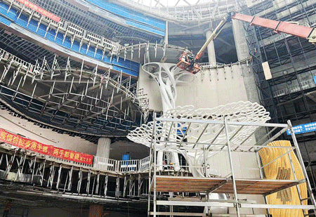 海口國際免稅城免稅項目由中國旅游集團投資。寶鷹承建的是海口市國際免稅城項目公共區(qū)域精裝修工程(一標(biāo)段)含地下室(除后勤精裝修外)、首層、中庭及電梯橋廂等區(qū)域,是項目的核心區(qū)域,施工體量大、技術(shù)要求高,其中中庭部分風(fēng)格多樣、造型獨特、施工難度大。