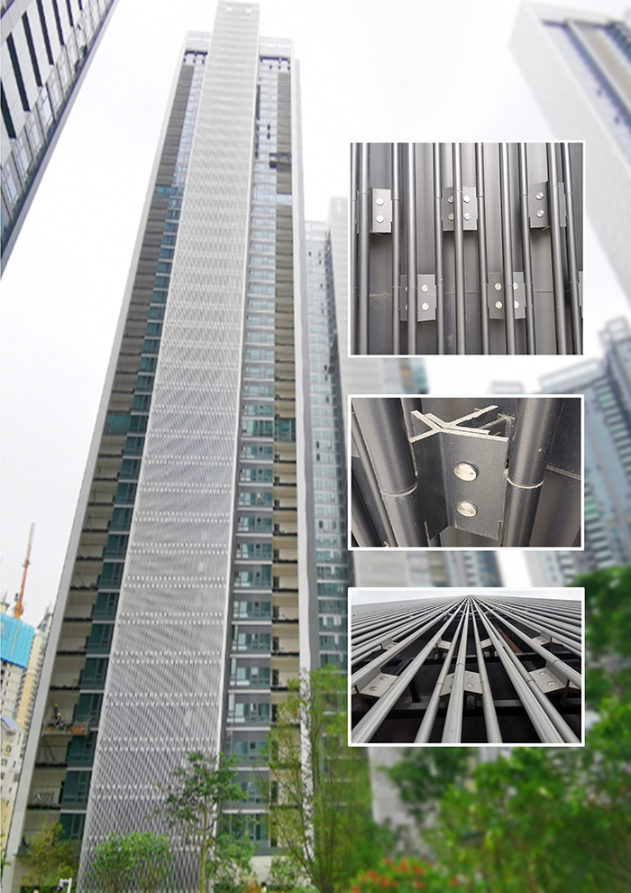 為了解決扁管形、方管形等傳統(tǒng)格柵幕墻施工的安裝技術(shù)難題,寶鷹集團(tuán)通過項(xiàng)目施工安裝實(shí)踐,積累豐富的實(shí)踐經(jīng)驗(yàn),取得了“圓管格柵幕墻施工技術(shù)”的研究成果。圓管格柵幕墻施工技術(shù)是在鋁板幕墻系統(tǒng)的基礎(chǔ)上外加圓管格柵系統(tǒng)組成的一種幕墻形式。該技術(shù)已在多個(gè)項(xiàng)目成功運(yùn)用,并取得了較好的社會(huì)效益和經(jīng)濟(jì)效益。