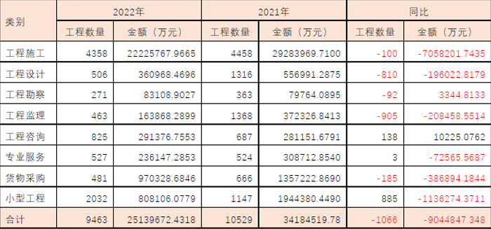 2022年深圳市建設工程(含小型工程)相關招標項目共計9463項,中標總金額2513.97億元,同比下降26.45%,下滑趨勢明顯。其中,工程施工招標項目共計4358項,中標總金額2222.58億元,同比下降24.1%。
