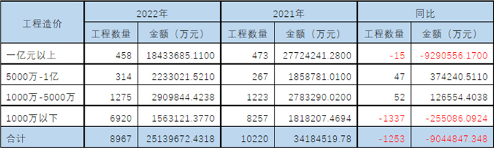 2022年重大項目逐步啟動,超1億元中標金額的工程項目對比2021年度小幅降低,但總投資金額下降明顯,這對以承接大工程為主的施工企業(yè)來說,整個市場大項目投資金額降低,經(jīng)營空間進一步壓縮。這對工程設計、勘察等方面也會造成影響。