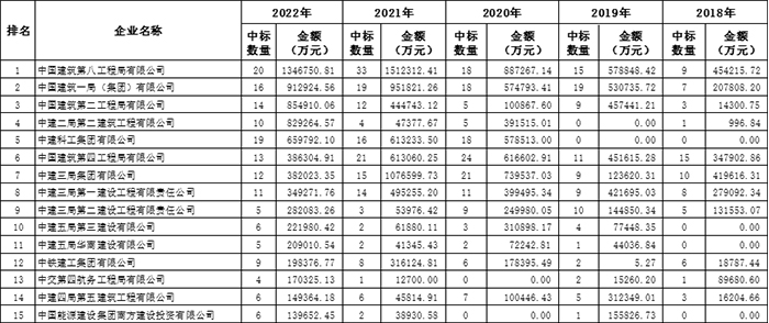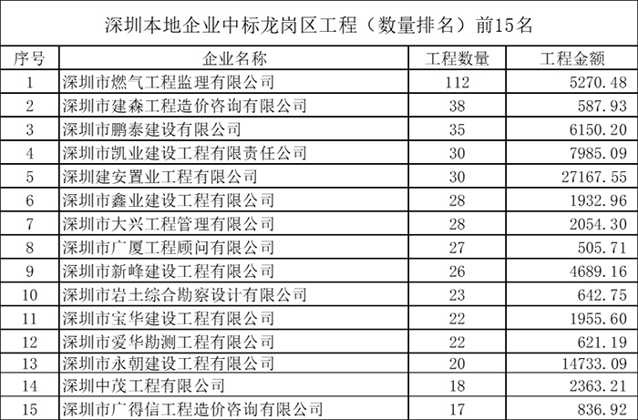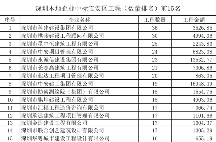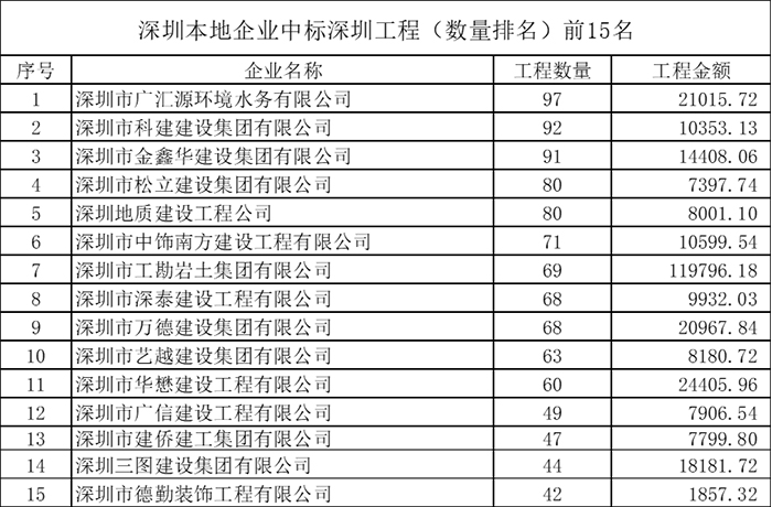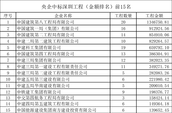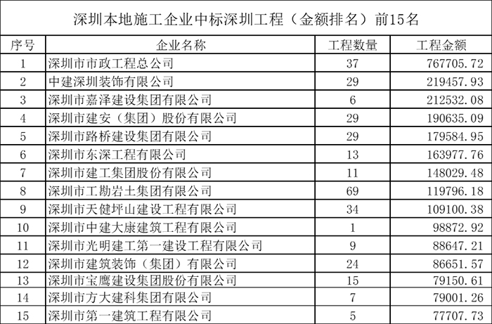2、深圳本地建筑施工企業(yè)2022年在深圳市建筑業(yè)市場中標排名前15名,按中標金額排名如下: