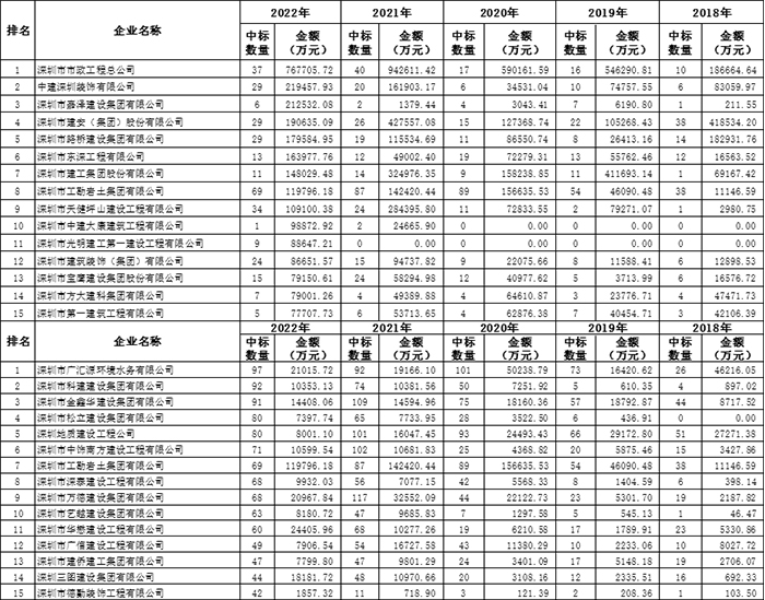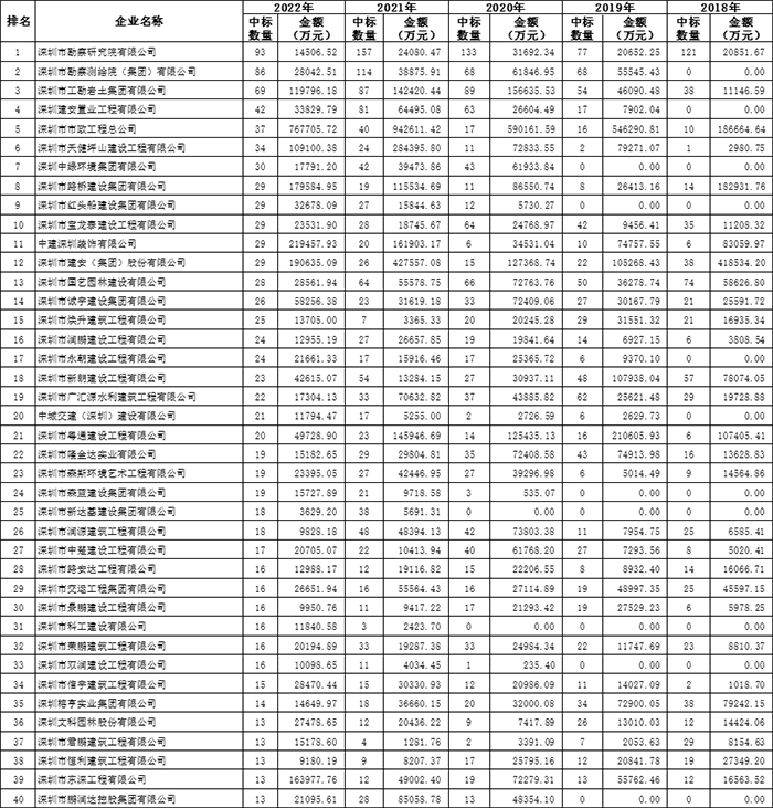 2021-2022年深圳市建筑企業(yè)“市政公用工程施工總承包一級和建筑工程施工總承包一級”企業(yè)在深中標數(shù)量排名前40名單位如下: