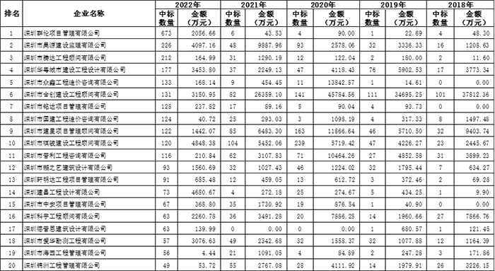 近五年在深圳市建筑業(yè)市場活躍的企業(yè)中標情況分析如下: