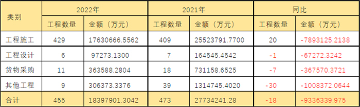 2022年工程施工招標項目金額同比下降24.1%,建筑業(yè)市場投資降幅明顯。