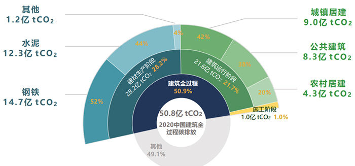 但是,中國建筑碳排放的總量龐大,建筑碳排放涉及建材生產(chǎn)、施工和建筑運(yùn)行三個(gè)重要階段。根據(jù)《2022年中國建筑能耗與碳排放研究報(bào)告》,2020年建筑全過程碳排放總量為50.8億噸二氧化碳,占全國碳排放的比重為50.9%,建筑行業(yè)實(shí)施碳達(dá)峰碳中和迫在眉睫。